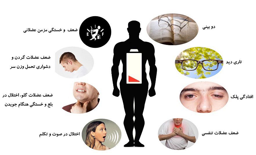 • ضعف عضلات که با فعالیت بیشتر می‌شود و با استراحت بهتر می‌شود.